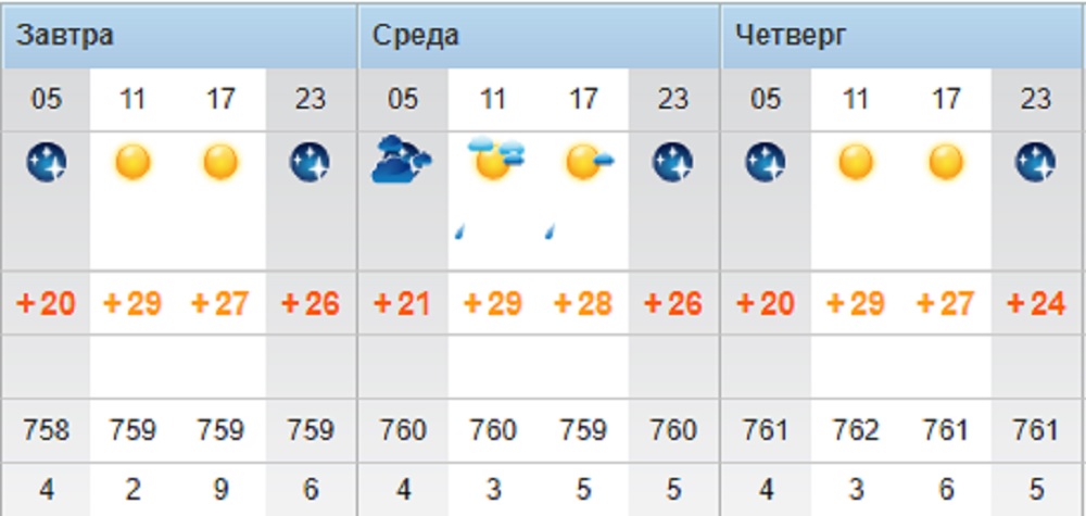 В среду, 20 июня, воздух прогреется до +28°С днем, ночью до +26°С. Днём возможны небольшие осадки. Ветер 3-5 м/с.