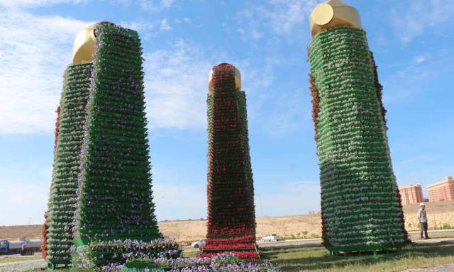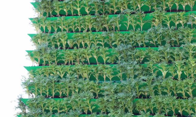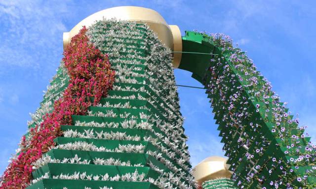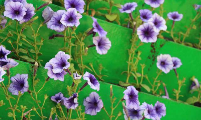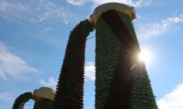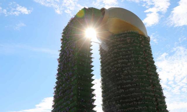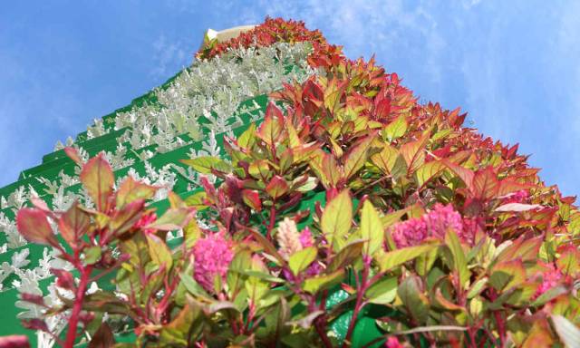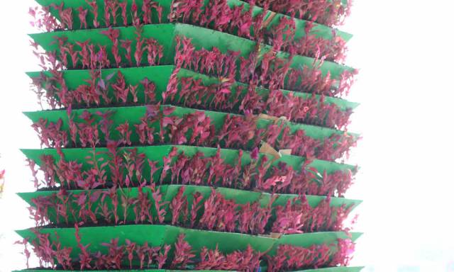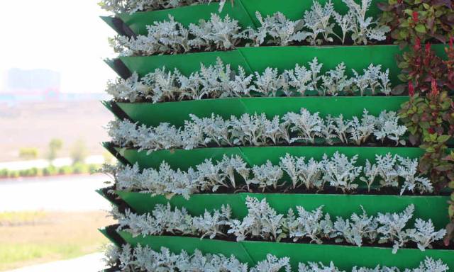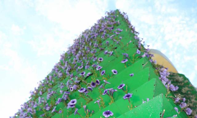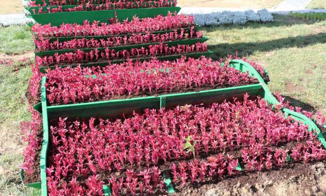 Объект «Цветочный водопад» - это вертикальные клумбы из разноцветных растений. Композицию уже украсили петунии, целозии, цинерарии и бархатцы.