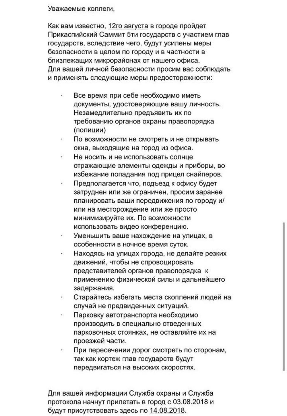 Жители Актау рассылают в мессенджерах и социальных сетях информацию о якобы правилах личной безопасности во время саммита. В ДВД Мангистауской области информацию назвали фейком.