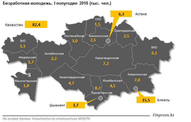 Наибольший уровень молодежной безработицы зафиксирован в Алматы — 15,5 тысяч человек. На втором месте Туркестанская область — 8,7 тысяч человек. Замыкает тройку Карагандинская область. В регионе насчитывается 7,2 тысячи человек безработной молодежи.
