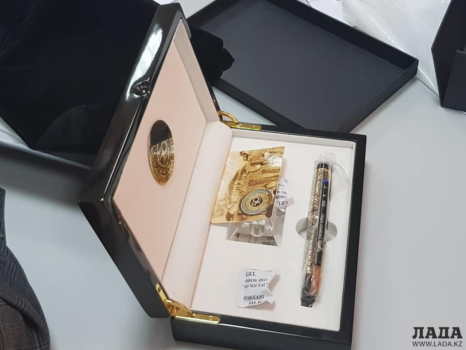 В качестве подарка госслужащим вручили ручки в коробках. Каждая из них оценивается примерно в 30 тысяч тенге.