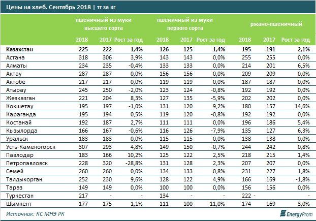 ржано-пшеничного хлеба в Актау составила 209 тенге. Лидером по цене стала Астана — 255 тенге. На втором месте Усть-Каменогорск — 244 тенге за кг. На третьем месте Семей — 231 тенге за кг.