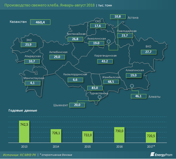 Объем производства хлеба с января по август в Казахстане составил 460,4 тысячи тонн . Лидером по производству стала Туркестанская область — 83 тысячи тонн.
