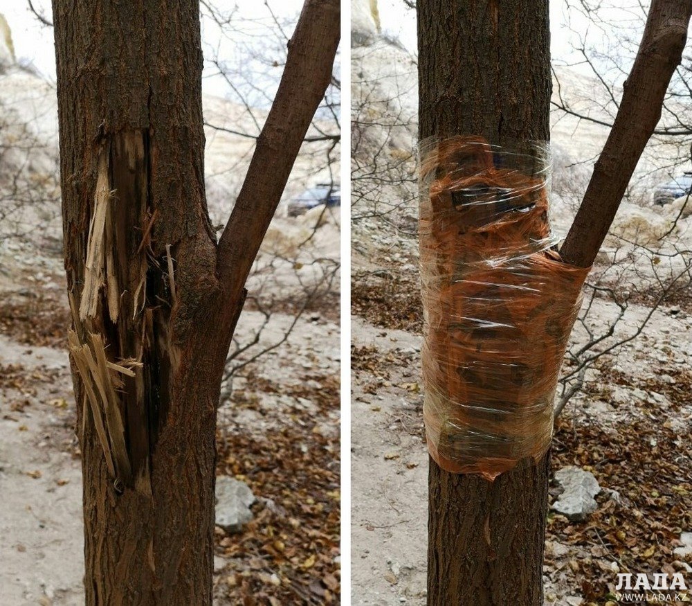 озвучена в Facebook путешественником Антоном Дикиным, и приводились фото гильз калибра 7,62 мм. Произведено около 10 выстрелов в дерево на одном уровне. Пули все прошли на вылет. Это варварство, такое могли натворить только нелюди. Мы когда увидели это дерево, не знали, что и придумать. Единственное, что пришло на ум — замотать целлофановыми пакетами и скотчем. Мы посоветовались со знающими людьми, и они сказали, если крона большая, то дерево скорее всего погибнет, - возмутился Юрий Песцов.