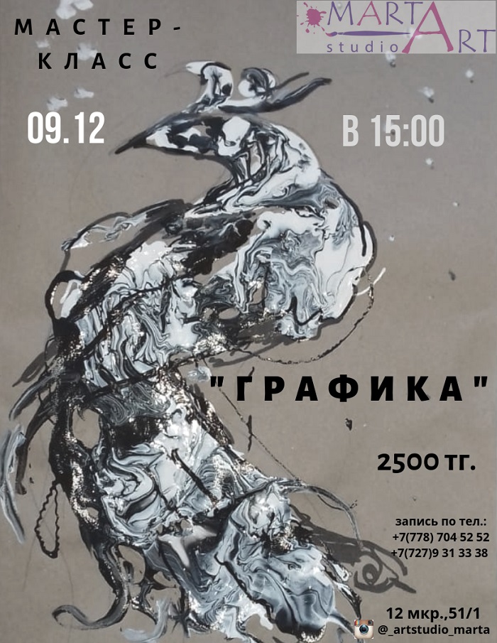 Художественная студия «МартАрт» приглашает на мастер-класс в технике «Графика». Занятия ведет один из лучших преподавателей города, известный художник Болат Бакибаев. Создайте уникальные вещи своими руками вместе с нашей студией. Мы научим вас поэтапному графическому рисунку карандашом. Вход платный. Место проведения: 12 микрорайон, здание 51/1 (напротив дома №65). Запись по телефонам: 8 778 7045252, 31-33-38.