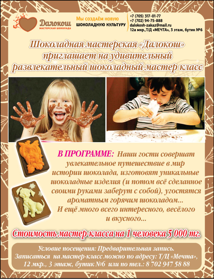 Подарите своим детям два часа приятной атмосферы и море шоколадного удовольствия. Музей истории шоколада «Далокош» приглашает на удивительные развлекательные мастер-классы. Наши гости совершат увлекательное путешествие в мир истории шоколада, изготовят уникальные шоколадные изделия (и потом все сделанное своими руками унесут с собой), угостятся ароматным шоколадом... И еще много всего интересного, веселого, вкусного. Стоимость мастер-класса на одного человека - 5000 тенге. Условия посещения: предварительная запись. Записаться на мастер-класс можно по адресу: торговый дом «Мечта», 12 микрорайон, 3 этаж, бутик №2 или по телефону: 8 702 947 58 88.