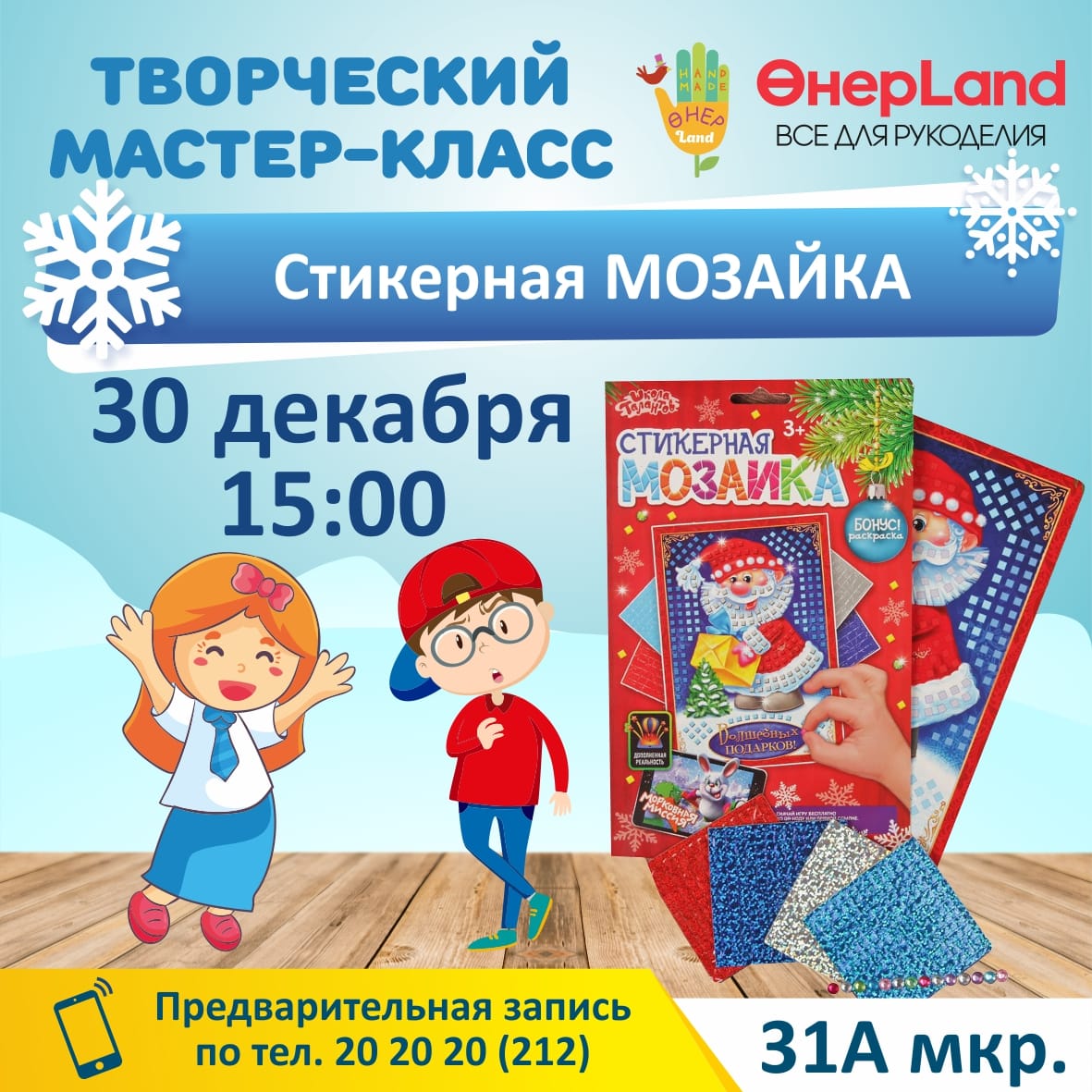 Жителей и гостей Актау в выходные дни приглашают в салон творчества «Онер Land» на мастер-классы. Предварительная запись обязательна. Контактный телефон: 8 777 088 5076 и 20-20-20 (212). Место проведения: салон «Онер Land», 31 микрорайон, рядом с мебельным центром «Prestige» и КМ «Уй кухни», 3А микрорайон.