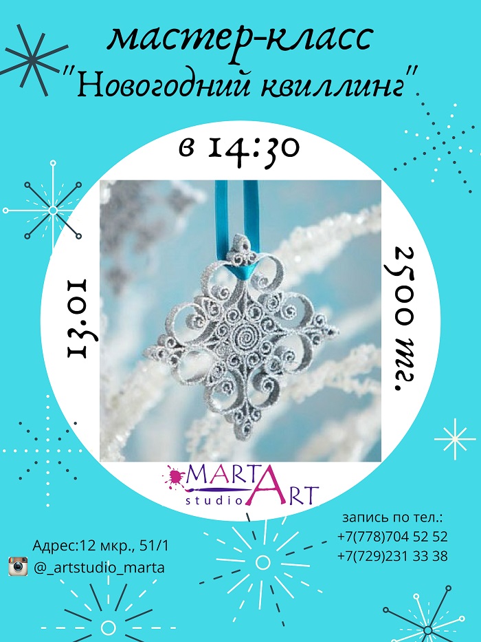 Художественная студия «МартАрт» приглашает на мастер-класс в технике «Новогодний квиллинг». Техника «квиллинг» как вид прикладного искусства продолжает набирать обороты. Она привлекает ажурностью и лёгкостью создания поделок. Вход платный. Место проведения: 12 микрорайон, здание 51/1 (напротив дома №65). Запись по телефонам: 8 778 7045252, 31-33-38.