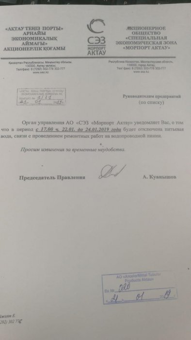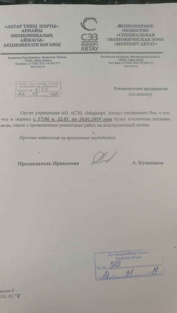 - Оповещение об отключении воды к жителям Актау никакого отношения не имеет. На территории специальной экономической зоны расположены 27 предприятий. Уведомление предназначено для руководителей этих предприятий, - сказал Ильдар Асманбетов, директор департамента технического обеспечения СЭЗ «Морпорт Актау».