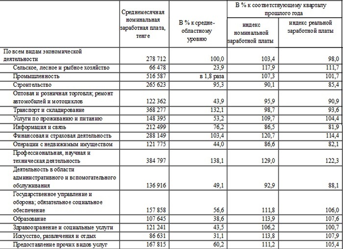 В ІV квартале 2018 года среднемесячная номинальная заработная плата одного работника на предприятиях Мангистауской области составила 278 712 тенге. Индекс номинальной заработной платы к соответствующему кварталу прошлого года составил 103,4 процента, индекс реальной заработной платы - 98 процентов.