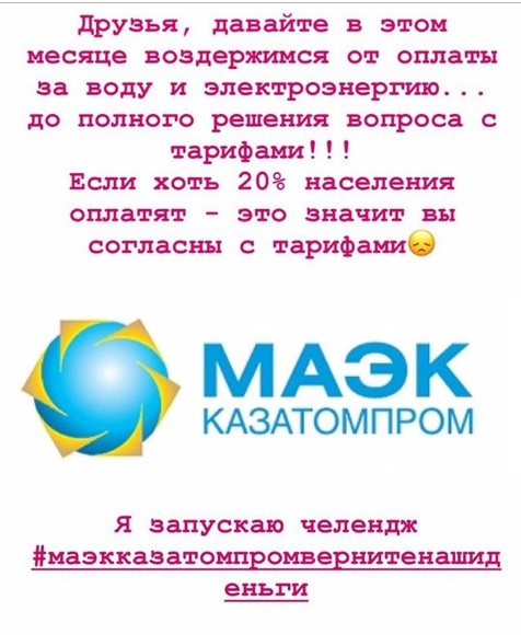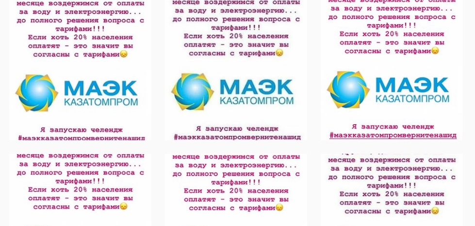 В социальной сети Instagram жители Актау запустили челлендж #маэкказатомпромвернитенашиденьги, в котором они призывают воздержаться от оплаты за воду и электроэнергию.