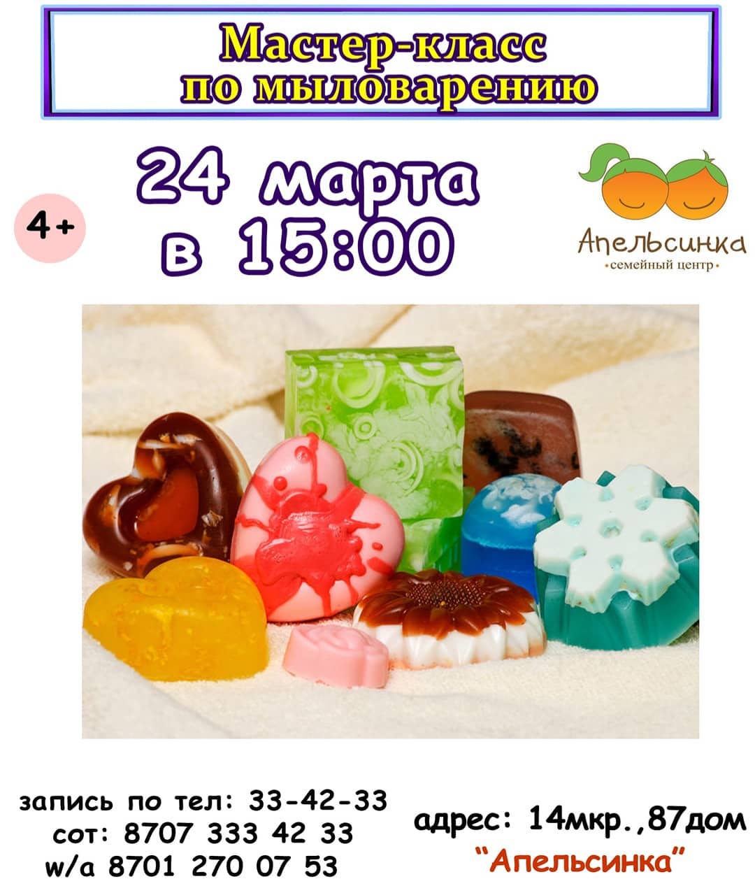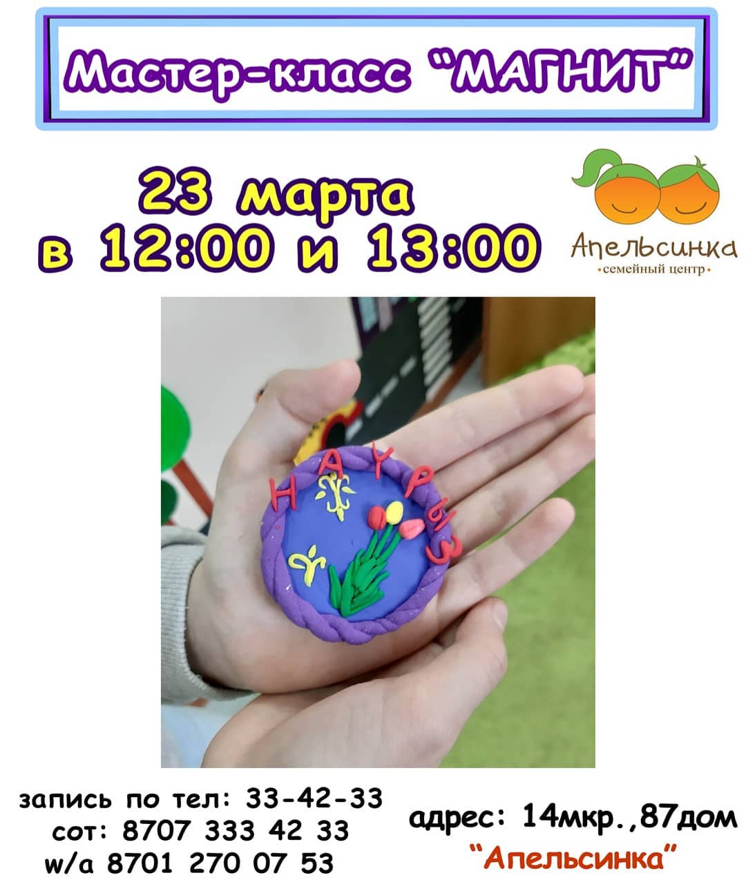 Семейный центр «Апельсинка» в выходные дни приглашает детей на мастер-классы. Место проведения: детский центр «Апельсинка», 14 микрорайон, 87 дом. Запись по телефонам: 33-04-68, 8 701 270 0753. Вход платный.