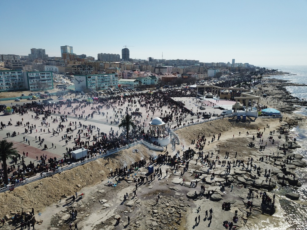 На побережье 15 микрорайона установлены юрты. Праздник нового года в Актау начался с театрализованной постановки. Тысячи людей собрались на набережной Актау, чтобы встретить Наурыз - праздник обновления природы, символ начала нового года и новой жизни. Артисты радуют горожан выступлениями.