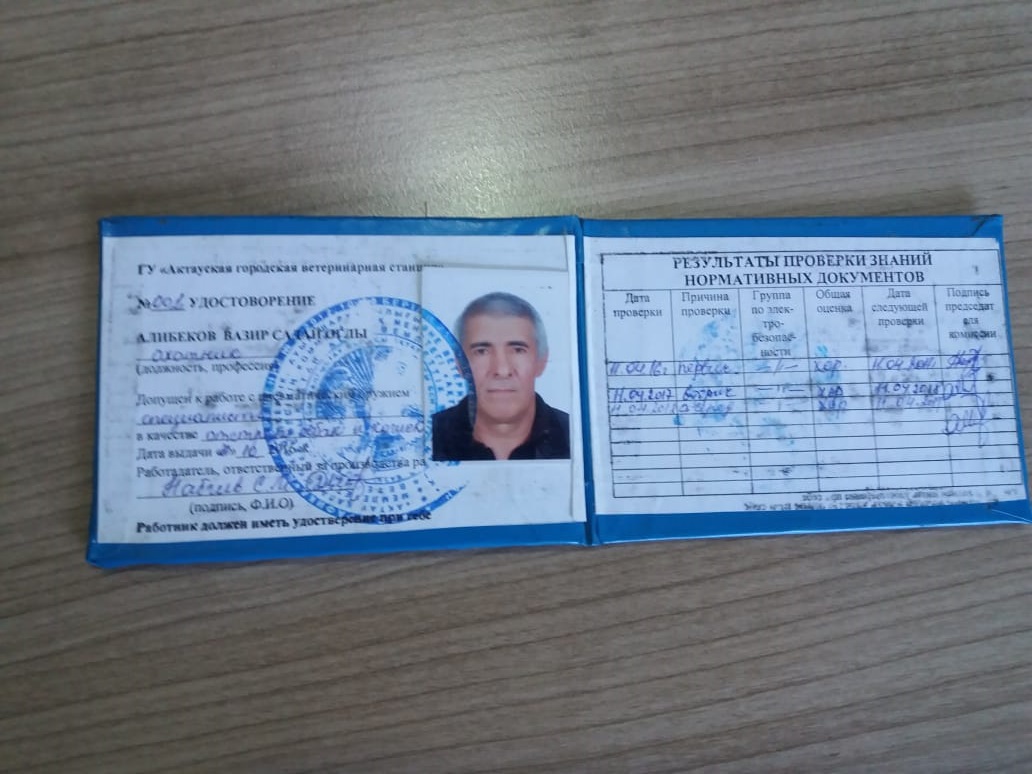Удостоверение работника городской ветеринарной станции. Фото предоставлено участковым 13 микрорайона Актау.Напомним, ранее жители Актау