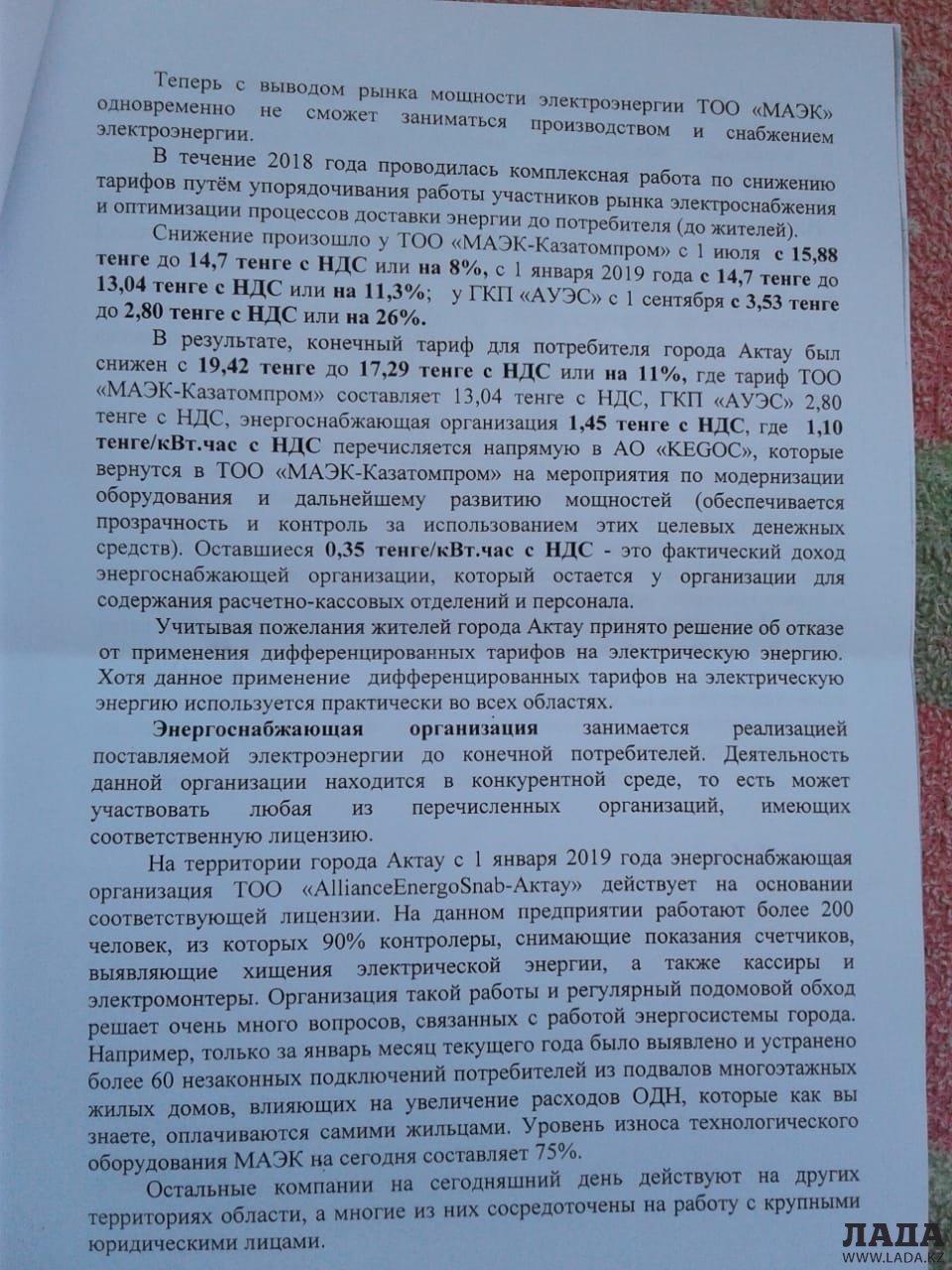 В ответе предоставлена информация о структуре тарифообразования на электроэнергию в Мангистауской области, а также об устранении 60 незаконных подключений к общедомовым сетям сотрудниками энергоснабжающей организации ТОО «AllianceEnergoSnab-Актау».