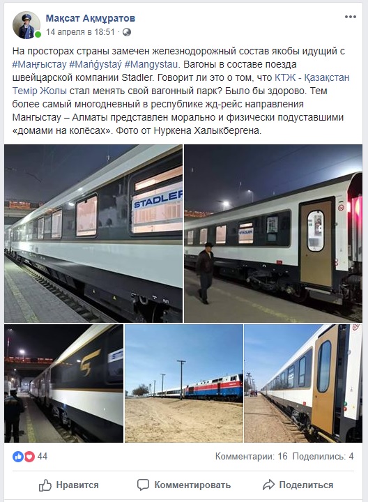 Пользователь Facebook Максат Акмуратов разместил на своей странице в Facebook фотографии пассажирских вагонов швейцарской компании Stadler Rail.