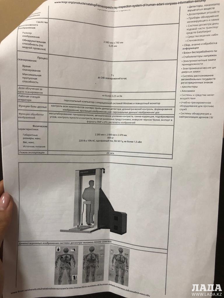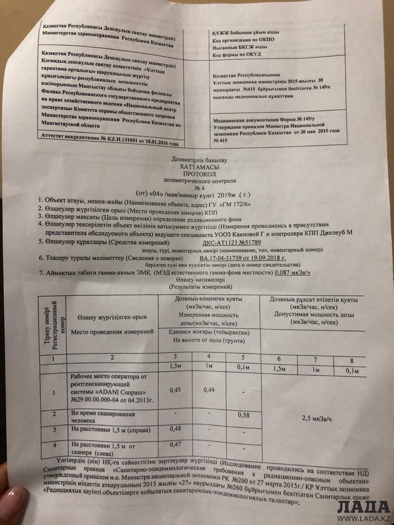 - Мы провели необходимый замер. Ренгеносканирующая система, установленная в ГУ «ГМ 172/6», не наносит вреда больше чем мобильный телефон, которым мы пользуемся ежедневно, или микроволновая печь. Все показатели не превышают норму. Такие же арки стоят во многих государственных учреждениях страны, и не зафиксировано ни одного случая, когда радиационные сигналы нанесли вред здоровью, – сообщила Асима Турдиева, руководитель Актауского отдела охраны общественного здоровья.