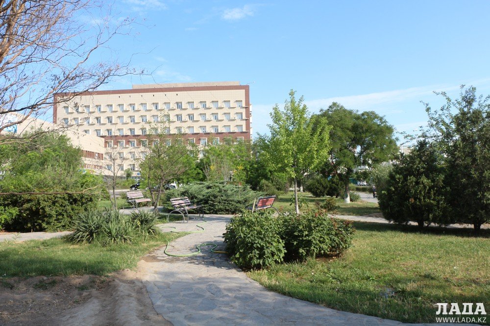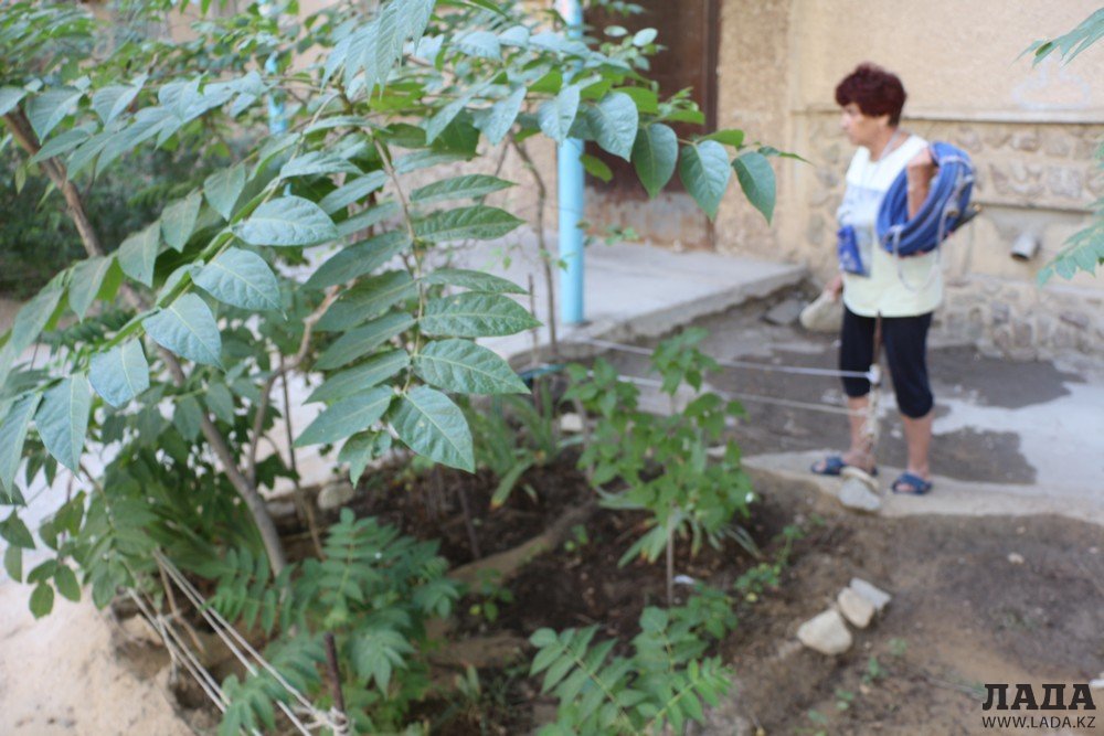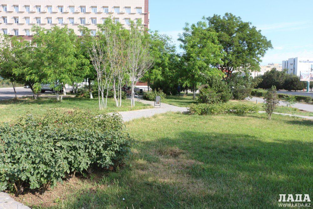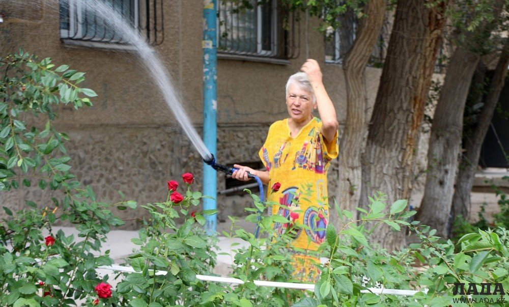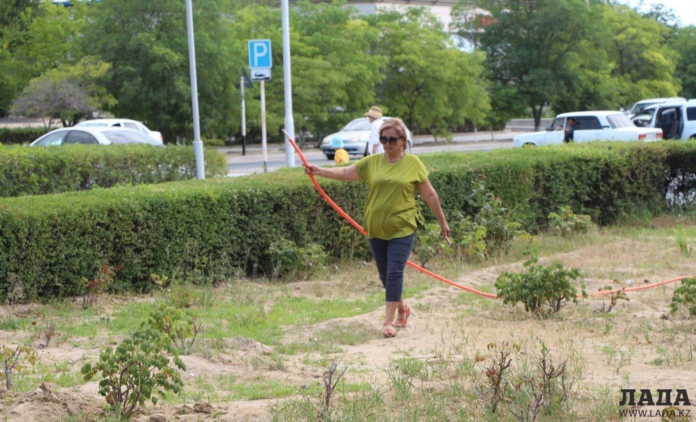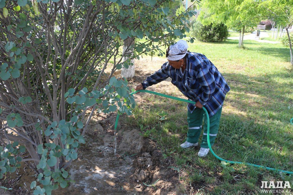 На пути нам встретилась работница ТОО «РЭП», занимающаяся поливом зеленых насаждений на территории городской поликлиники №1.