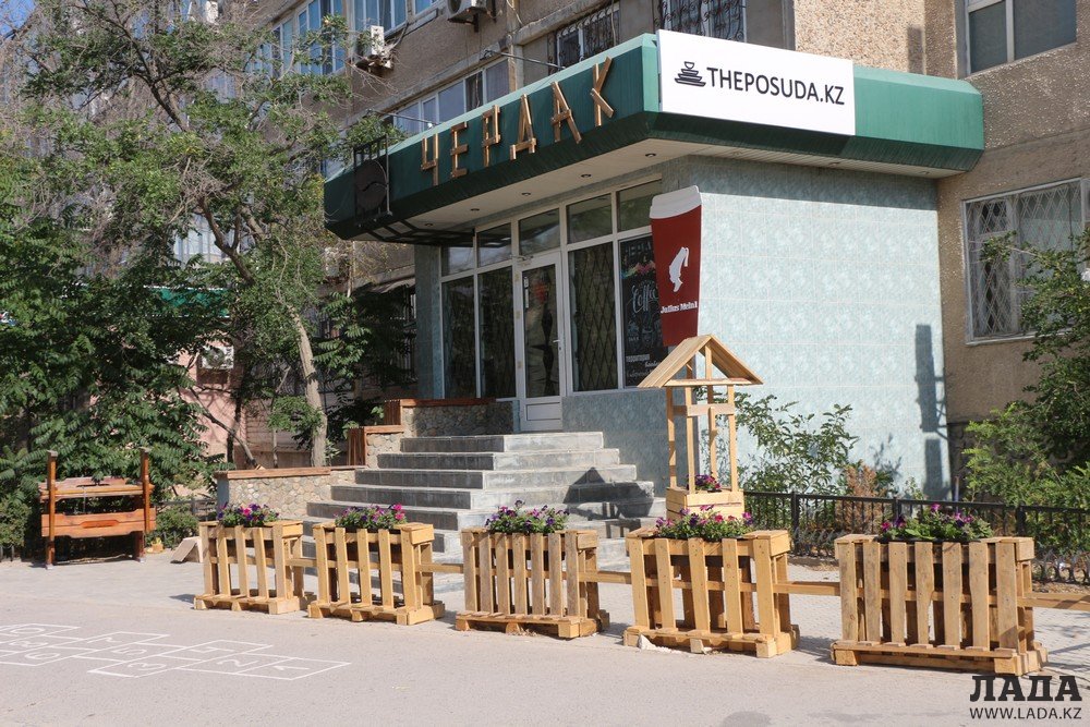 Ухоженная территория с высаженным газоном одного из кафе в 7 микрорайоне.