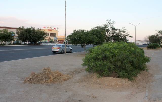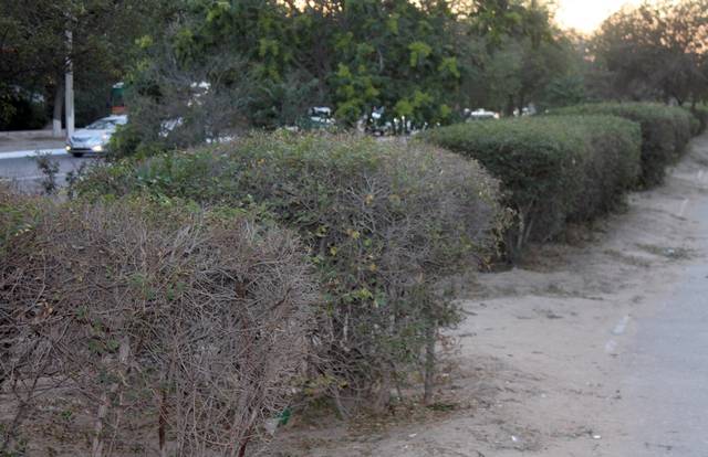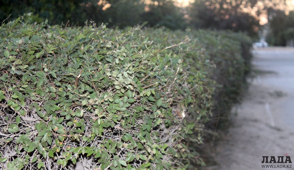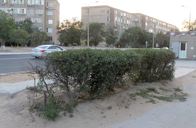 Кустарники вдоль дорог по периметру микрорайона пострижены, но не политы.