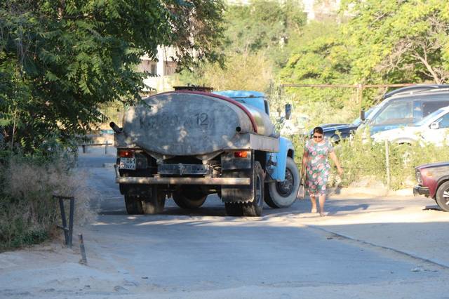 Работников «РЭП» мы застали утром 28 июня. Они осуществляли полив зеленых насаждений у двух домов №26 и №32. Дальше водовоз проследовал в сторону дома №25.