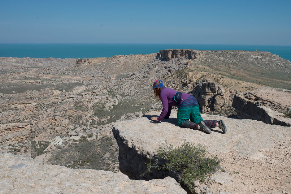 Расслабленные дневкой, не спеша поехали к Жыгылгану — в буквальном переводе это означает «упавшая земля». Упало около трех квадратных километров. Метров на 50 вниз. Подъехали, посмотрели сверху. Впечатляет, пугает, захватывает дух. Фотографии вообще никакого представления о масштабе не дают, нужно постоять на краю и понюхать ветер. Народу — никого. Потому что утро, но это одна из самых популярных достопримечательностей Мангышлака, и туристы скоро появятся. Еще не жарко, и мы спускаемся вниз сделать пару фотографий.