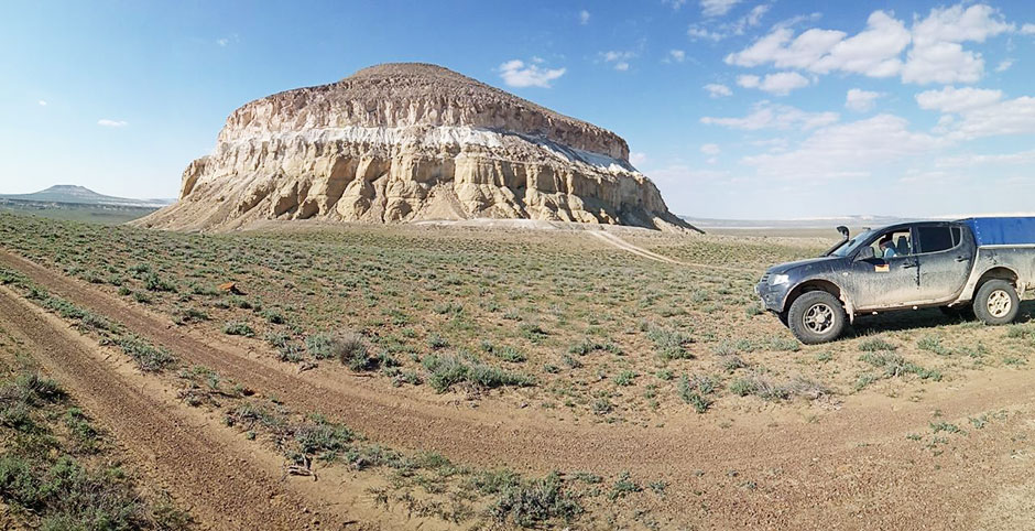 Ползем по жаркой степи, навстречу едет белая «Газель»: люди волнуются, не заблудились ли мы, не отбились ли от автобуса, и не наш ли «синь-машын» одиноко стоит на обрыве. Это очень профессионально, потому что синих частей после степи на пикапе видно не так много. «Это место знаете? Жыгылган! Люди жили, потом все упало!» — кратко резюмируют историю края люди из «Газели».