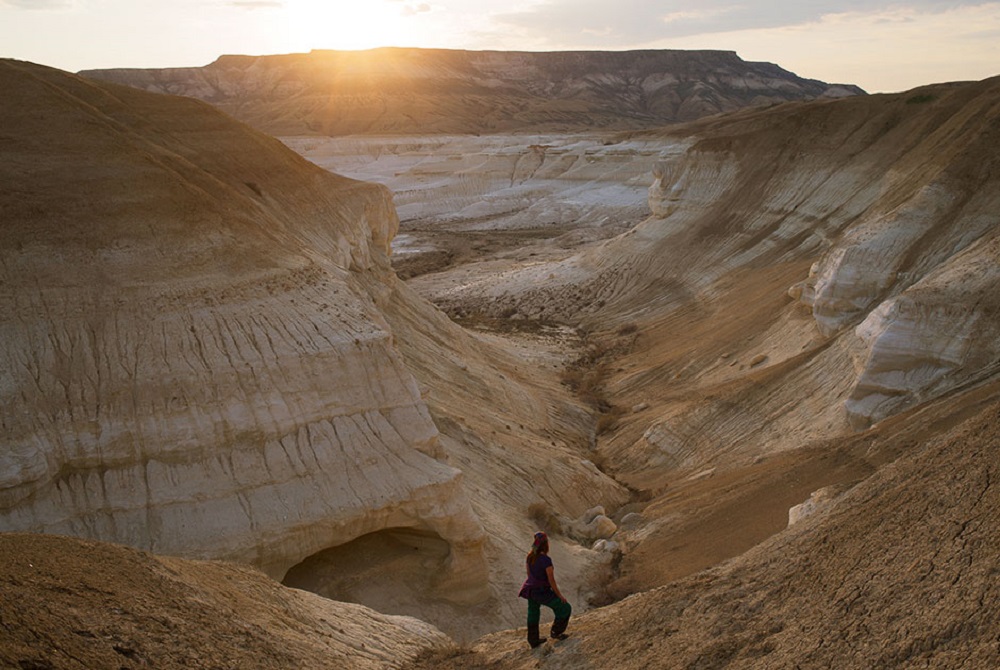 Макс ставит палатку, а мы с Людой идем бодрым темпом по направлению к соленому озеру. Спускаемся с желтых песчаных холмов по руслу весеннего ручья, проходим узкой долиной и попадаем на планету Татуин из «Звездных войн». В закатном свете все вокруг настолько нереальное, что я повизгиваю от страха и восторга одновременно.