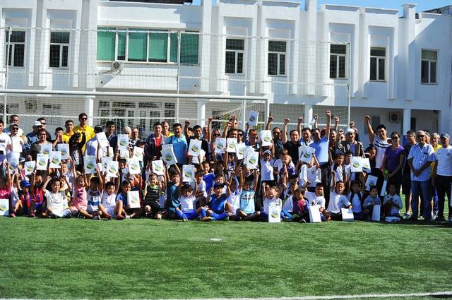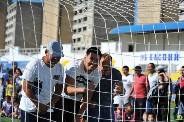Представители футбольного клуба «Каспий» подарили всем детям блокноты, ручки, плакаты с фотографией футболистов, а также индивидуальные фотографии с автографами игроков.