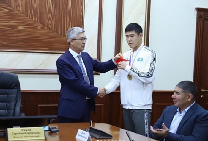 А также глава региона особо отметил большой вклад тренеров, воспитавших Бекзада. Первому тренеру боксёра Батырбеку Джайлибаеву вручили сертификат на 3 миллиона тенге, а его нынешнему наставнику Марату Джакиеву сертификат на 5 миллионов тенге.