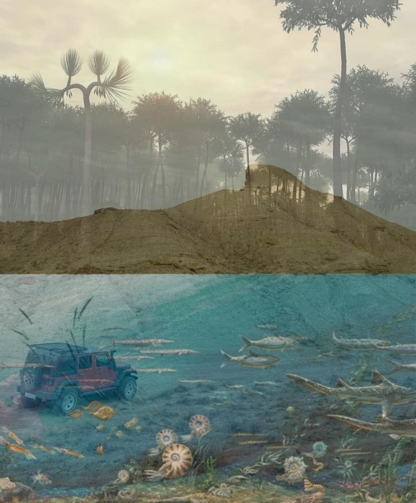Любитель-палеонтолог Владимир Ярцев опубликовал фотографии находок в районе хребта Западный Каратау на своей странице в Instagram. Владимир обработал фото в программе, чтобы наглядно продемонстрировать предположительную картину Мангистауской степи в древности.