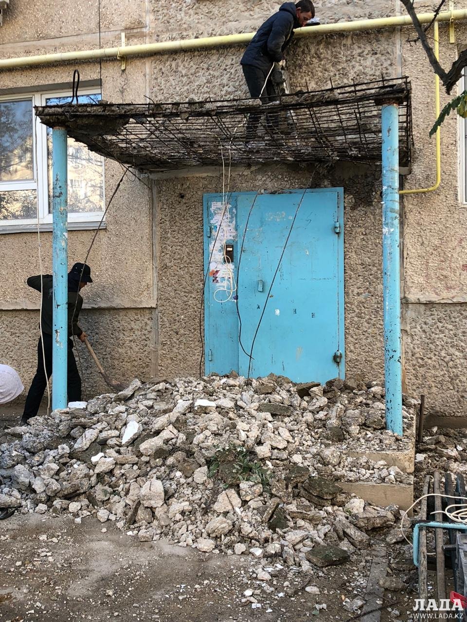 По словам жительницы 15 дома в 12 микрорайоне, в ночь со 2 на 3 ноября она услышала громкий звук. Выглянув в окно, увидела, что козырёк подъезда полностью обрушился.