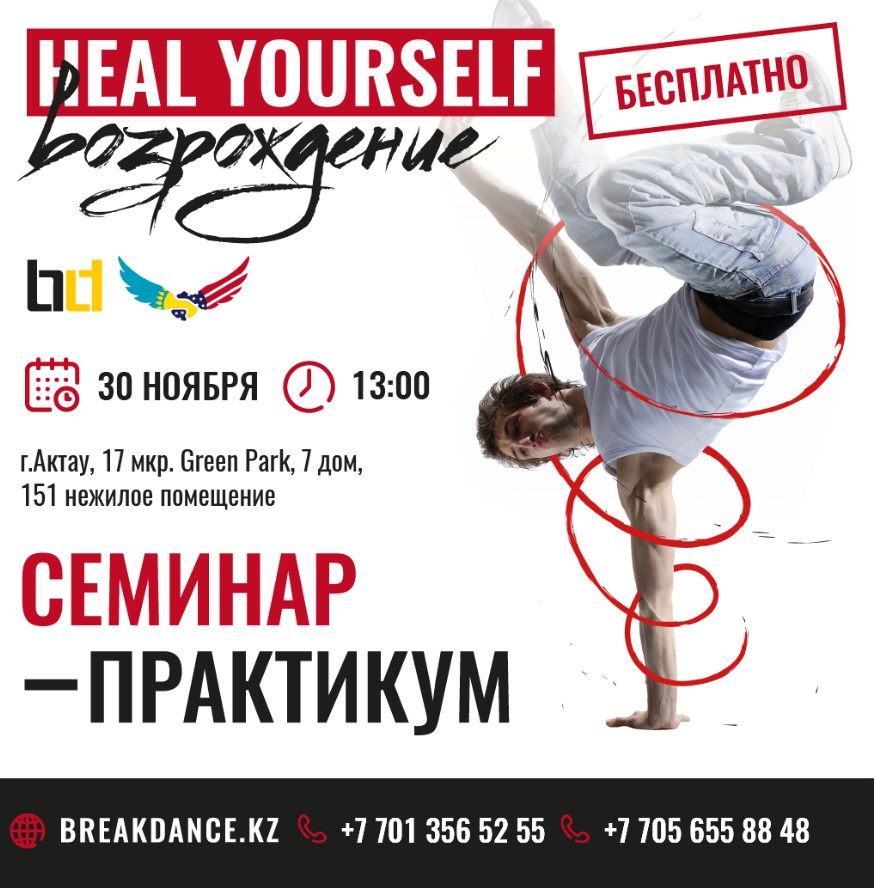 В Актау 30 ноября в рамках проекта «Heal yourself Возрождение» пройдет семинар-практикум. Бесплатное участие в семинаре сможет принять любой житель региона. Мастер-класс пройдет в 13:00 в здании Green Park, дом №7, помещение №151.
