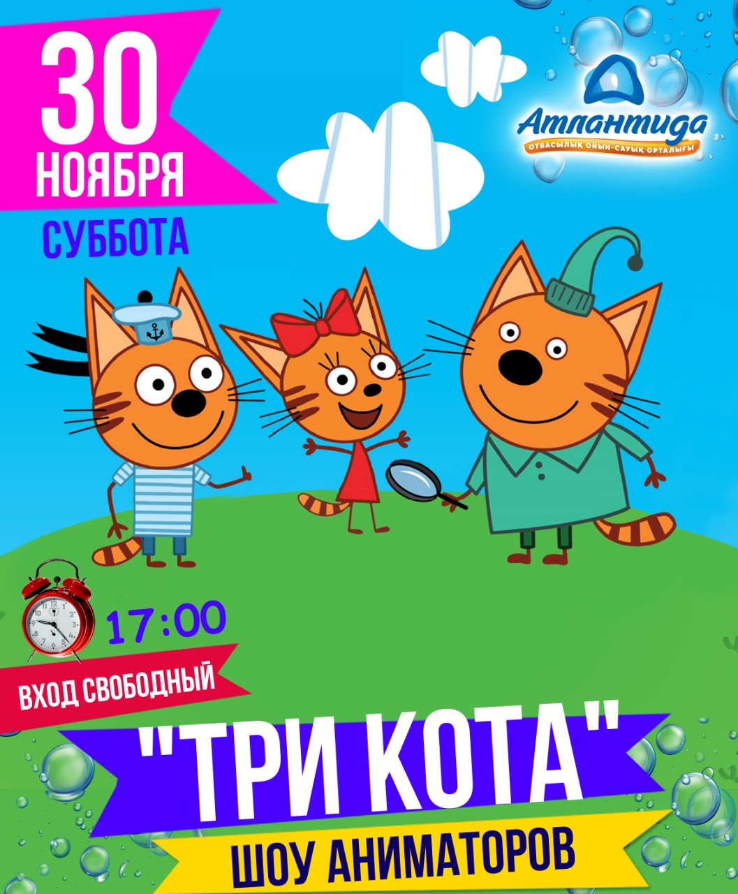 В семейном развлекательном центре «Атлантида» в выходные дни пройдут зажигательные шоу-программы с участием веселых аниматоров. Отличное времяпрепровождение для всей семьи. Место проведения: семейный развлекательный центр «Атлантида», расположенный на четвертом этаже универсального торгового центра «Заман». Вход бесплатный.