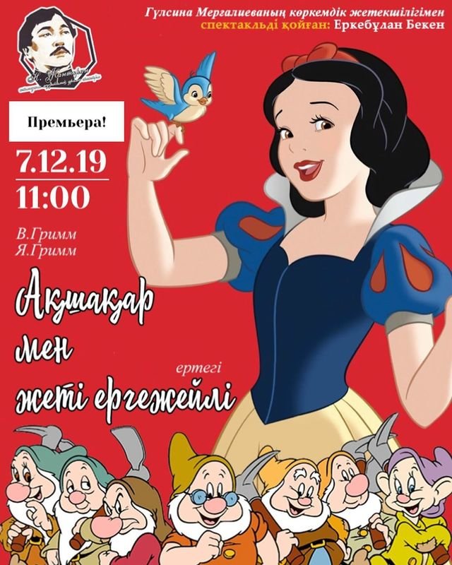 В областном музыкально-драматическом театре имени Н. Жантурина в субботу, 18 января, пройдёт показ спектакля «Белоснежка және жеті гном». Вход платный. Телефон кассы: 60-10-04.