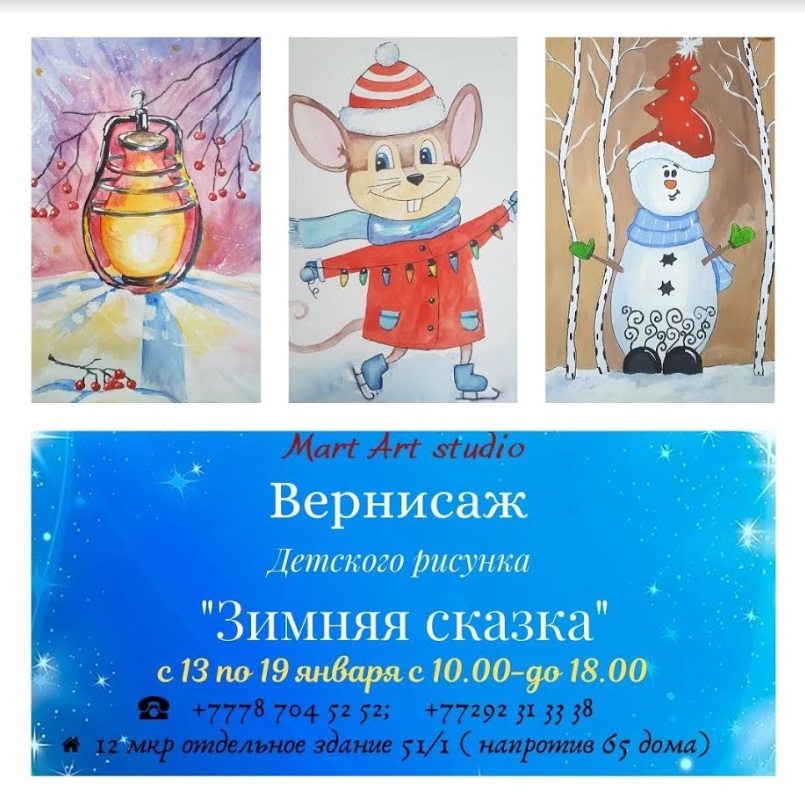 Художественная студия «МартАрт» приглашает 18 и 19 января жителей Актау на вернисаж детских рисунков «Зимняя сказка». Мы предлагаем взглянуть на рисунки наших студийцев, и вы удивитесь как много интересных и разнообразных идей можно придумать на эту сказочную для детей тему. Вы окунётесь в иной мир, полный фантазий, интересных персонажей и сказочной зимы.
