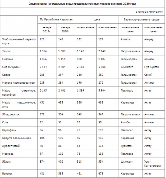 Комитет по статистике РК сравнил, в каких регионах зафиксированы максимальные и минимальные цены на продукты. К примеру, в Актау самые дорогие овощи, фрукты, сливочное и подсолнечное масла. В Алматы же самые высокие цены в стране на яйца, сметану, молоко и соль. А вот хлеб дороже всего в Атырау.