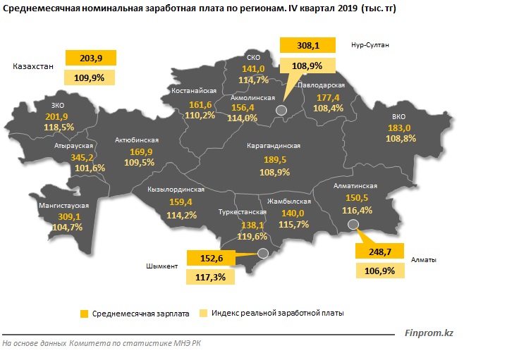 Finprom.kz, получают жители двух нефтяных регионов и обеих столиц. Во всех остальных регионах страны, кроме этой четвёрки, показатель ниже среднего по Республике.