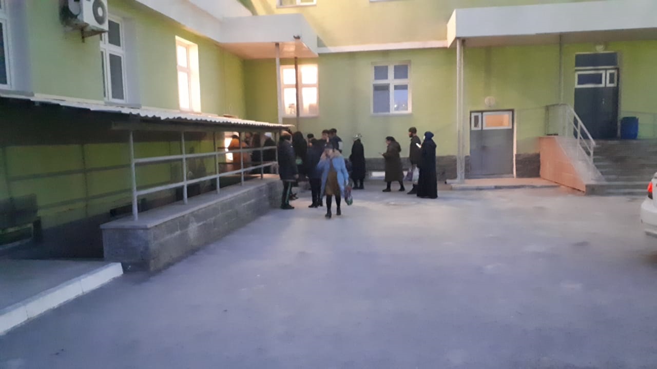 По словам людей, при передаче продуктов и личных вещей роженицам образуется огромная очередь из-за маленького окошка в пункте передачи областного перинатального центра.