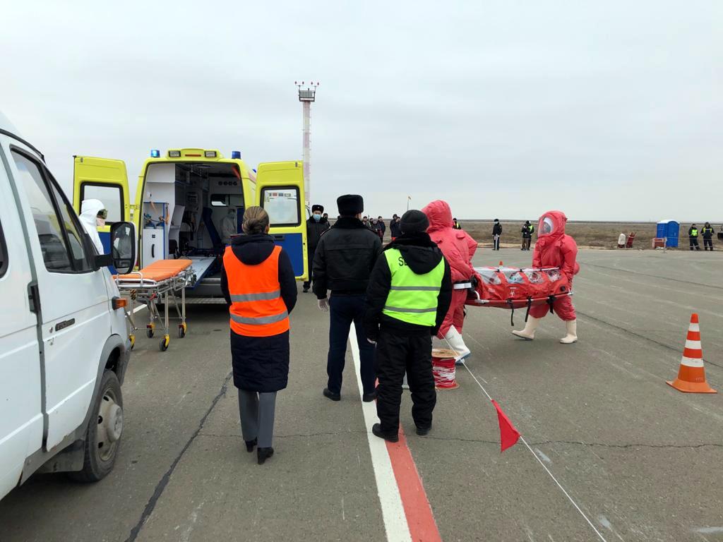 Больного в капсуле госпитализировали в больницу, а других пассажиров вывели по трапу из самолёта и доставили в зал прилёта. На аэродроме их документы проверили на портативном устройстве, чтобы не было контакта с вещами. В аэропорту также была проведена заключительная дезинфекция воздушного судна.