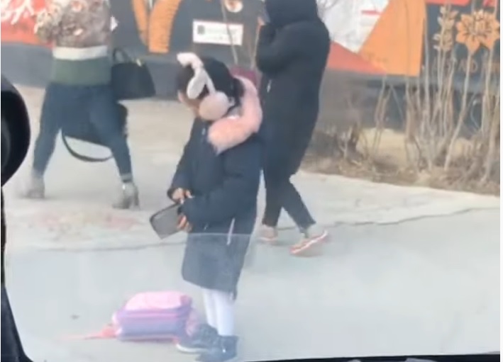 На кадрах видео видно, что действие происходит возле гостиницы «Актау». Школьница ищет деньги в кошельке, а затем отдает их мужчине, который просит милостыню.
