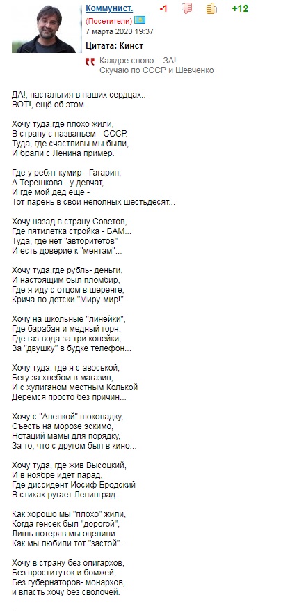 Вот именно, я не понимаю чего вы добиваетесь. Если ностальгия по молодым годам, когда деревья были большими, то я понимаю. Я сам порой скучаю по тем безбашеным временам. Но вот сейчас к чему вы призываете молодежь? К революции и гражданской войне? Ведь для того чтоб вернуть советский строй нужно пролить много крови, в том числе и тех кто сейчас за него топит по незнанке, но не представляет что это. Пусть Собачье сердце пересмотрят, чтоб хоть каплю понять как это было, когда *** приходят к власти.