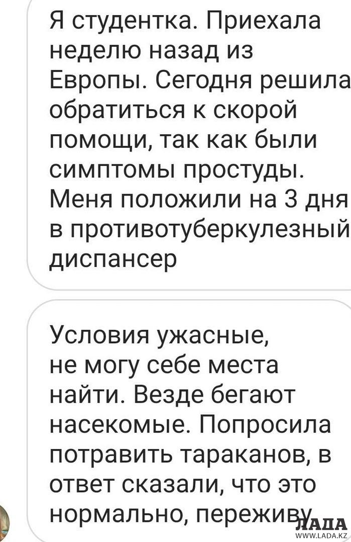 Жительница Актау находится в Мангистауском областном противотуберкулёзном диспансере на карантине. По её словам, насекомые кишат в палатах и столовых. Руководство медучреждения опровергло жалобы пациентки.