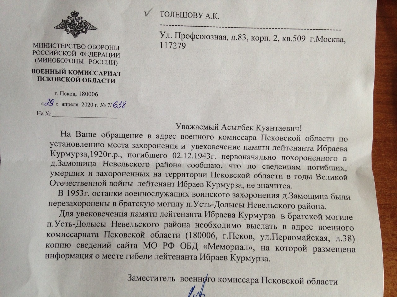 Чтобы найти место захоронения, Асылбеку Толешову пришлось обратиться в военный комиссариат Псковской области, где ему сообщили, что тело Ибраева было перезахоронено в братской могиле из деревни Замошица в поселок Усть-Долысы Невельского района области.