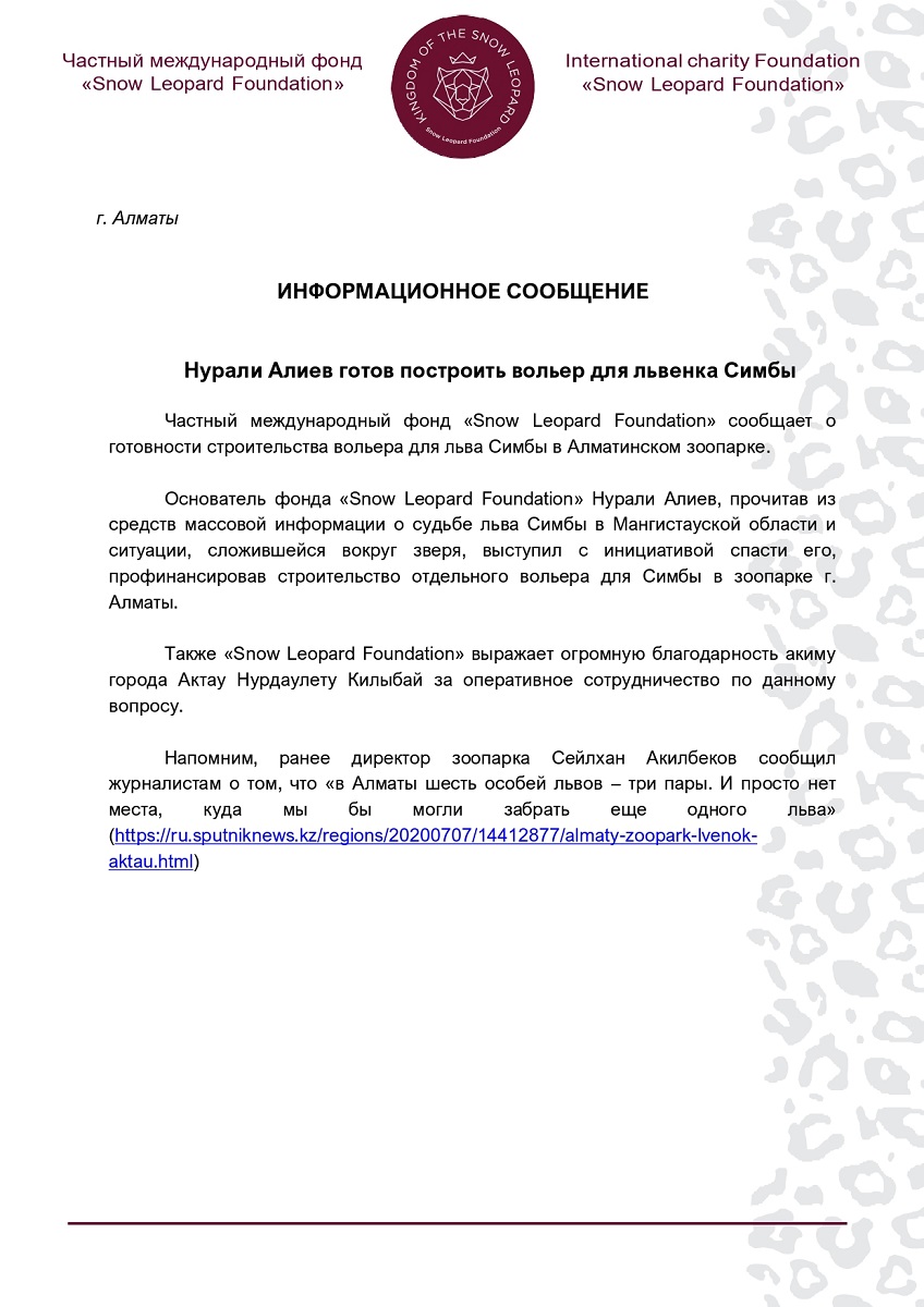 Основатель фонда «Snow Leopard Foundation» Нурали Алиев, прочитав о судьбе льва Симбы в Мангистауской области и ситуации, сложившейся вокруг зверя, выступил с инициативой спасти его, профинансировав строительство отдельного вольера для зверя в зоопарке Алматы.