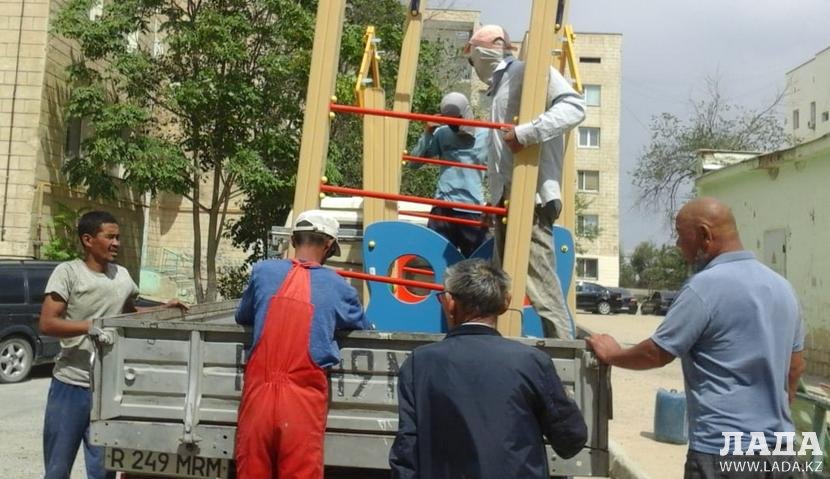 По словам сотрудников акимата, установка элементов детских площадок входит в план благоустройства города.