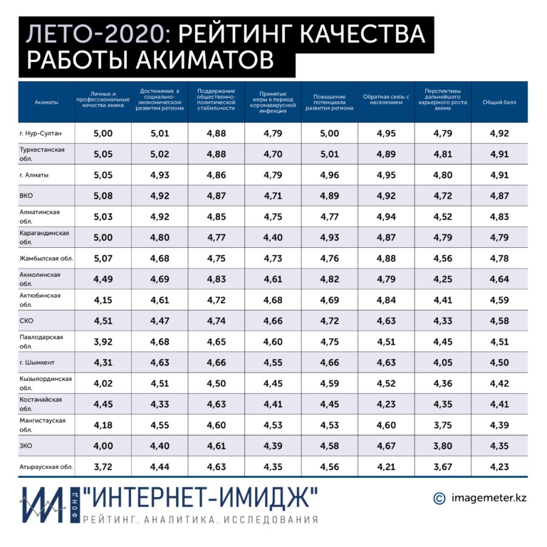 По данным Фонда «Интернет-Имидж», лидерами рейтинга качества работы акиматов являются: