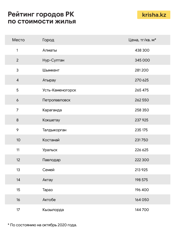 krisha.kz составил рейтинг городов Казахстана по стоимости жилья. В него вошли 17 населённых пунктов, по которым проводился мониторинг.