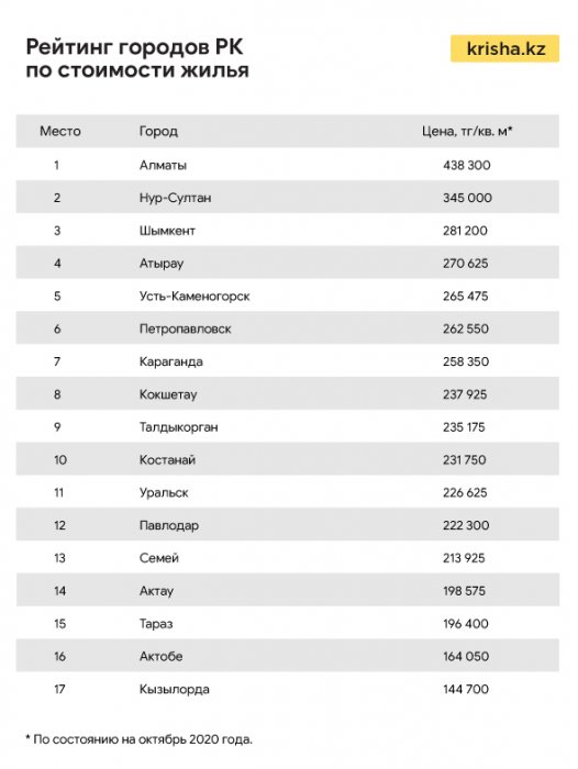 Рейтинг городов Казахстана с самыми дорогими квартирамиПервое место с самыми дорогими квартирами в стране традиционно занимает Алматы. Средняя цена предложений на начало октября в южной столице составила 438 300 тенге за квадратный метр. Учитывая площадь стандартных объектов (1-комн. — 38 кв.м, 2-комн. — 56 кв.м, 3-комн. — 70 кв. м), они обойдутся примерно в 16,7 миллиона тенге, 24,5 миллиона тенге и в 30,7 миллиона тенге.