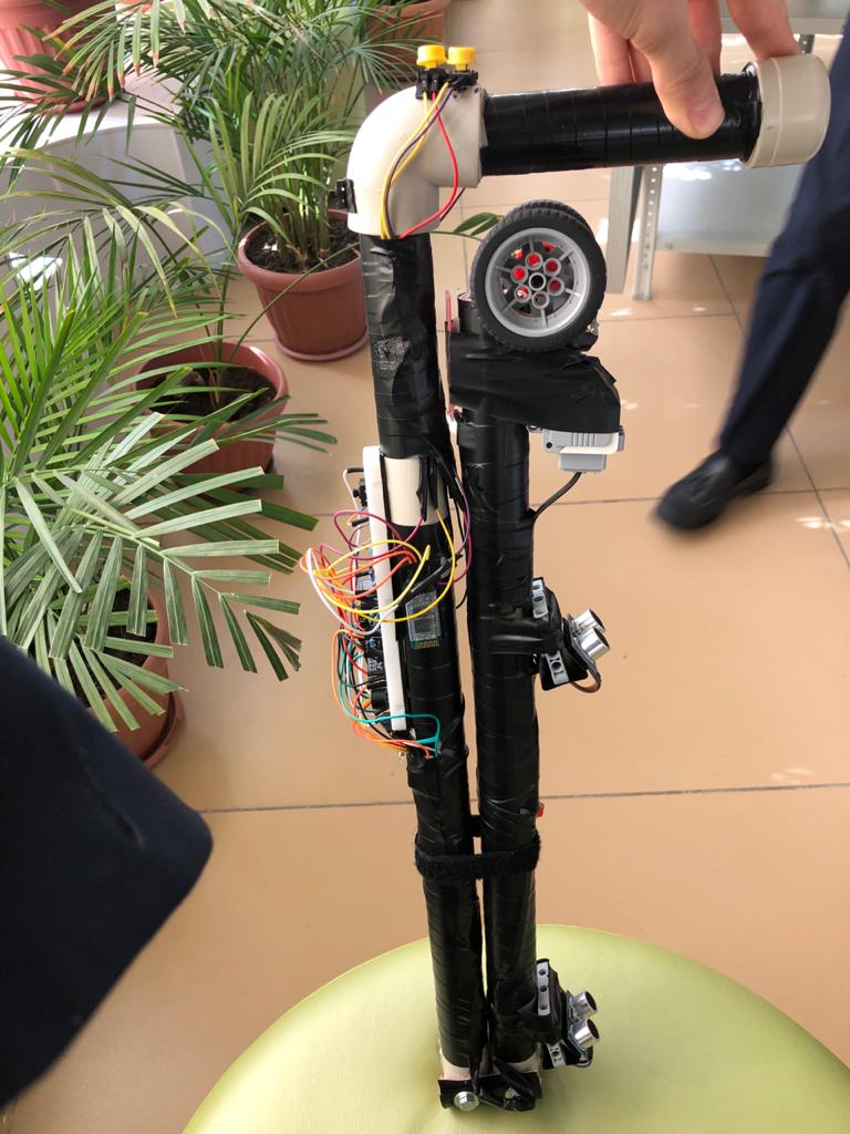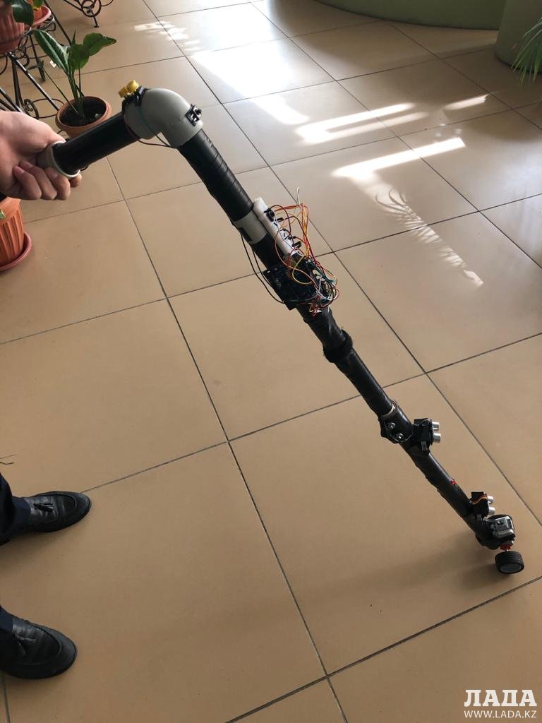 Автоматизированную трость для слабовидящих выпускники НИШ Галаммадин Аскар и Сагынбек Талгатулы создали под руководством учителя физики Дамира Еркмалиева. По их словам, идея возникла после просмотра интервью со слепым человеком.